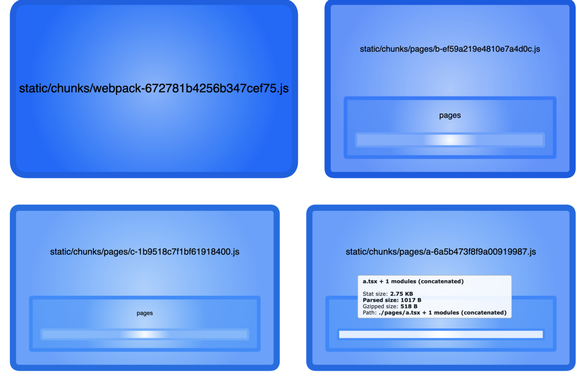 これは、A, B, Cページに無駄なコードが必ず含まれているということです。 Aページでquery: Aを呼んだだけにも関わらず他のページで使われているqueryがチャンクに存在し、これはAからすると不要です。本来これは、生成ファイルを一つに結合するべきではなくその親チャンクと結合し生成ファイルは分解されるべきです。
